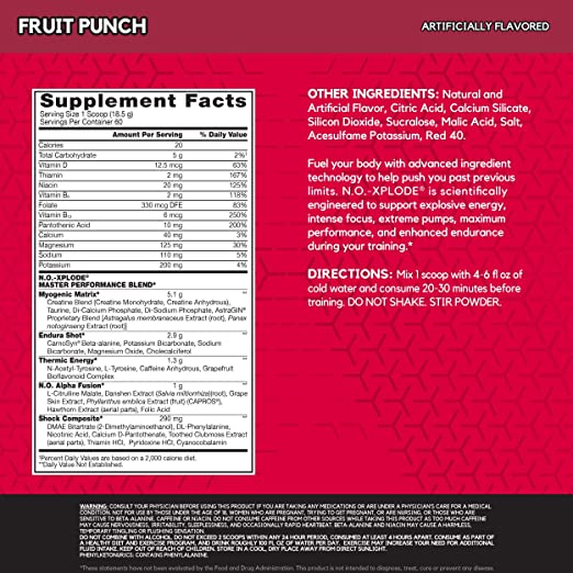 Each serving of N.O.-XPLODE Delivers 275mg of caffeine, 1.8g of Beta-Alanine, and extreme focus. Get ready to slam plates longer and workout harder. BSN® has re-ignited N.O.-XPLODE®, the first complete pre-workout that launched in 2004 and has been helping athletes break through barriers ever since. Now with more energy, more feel, more focus, and amazing taste. The weights won’t know what hit them.