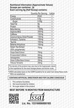 Beta-Alanine, Arginine AKG, Caffeine, Coconut Spray Dried Powder, N-Acetyl L Tyrosine, Taurine, Betaine Anhydrous, Green Tea Extract, Grape Seed Extract, Encapsulated Caffeine, Ashwagandha, Green Coffee Bean Extract, Tribulus terrestris, Acidity Regulator(INS 330), Artificial Sweetener (INS 955), CONTAINS PERMITTED SYNTHETIC FOOD COLOURS ( INS 110) AND ADDED FLAVOURS( Natural identical flavoring substances)